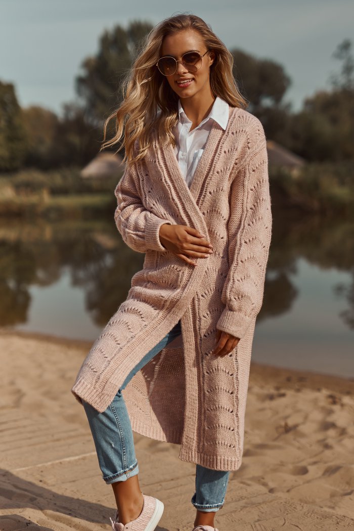 Długi sweter damski kardigan bez guzików brudny róż S126 | polskie …